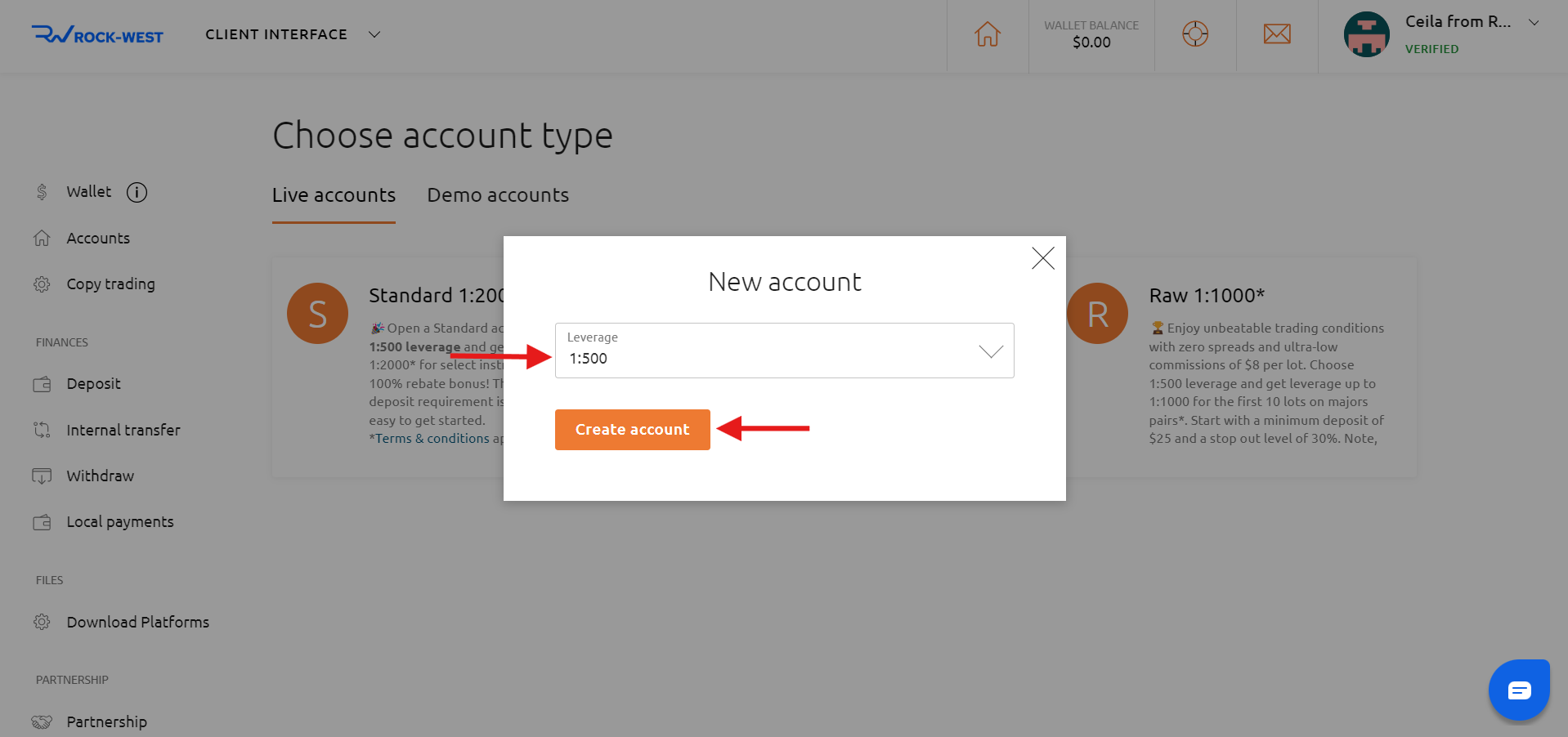Select the appropriate Leverage - The following Leverages are available for Raw accounts; 1:100, 1:200. 1:300, 1:400
